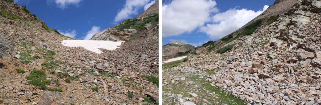Once there, I should have been able to take the road back to my truck, but there was snow still covering it, even in mid-July, so I retraced my steps and took the first gully of the day again, but you should be able to take the road back all the way.  If not, it’s an easy and obvious workaround.