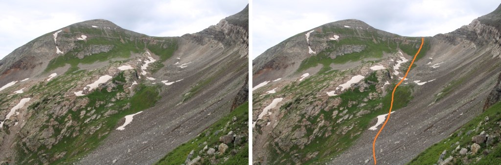 Once down the gully, I stayed right of the rock rib, but headed back towards Yule Pass.