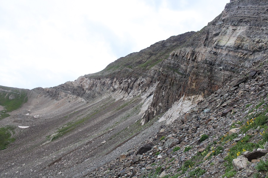 I was glad I didn’t have to downclimb those slabs, as when wet they would have been a challenge. Instead, I continued on towards Treasure Mountain, following the ridge for a bit to the northwest, then dropping down once I could see the defunct mine below. From the summit of Treasury, it looks like the ridge goes all the way to Treasure, and it does, most of the way, but the area circled in red isn’t climbable without rope. It’s part of a band of rock in the mountain that spans its whole side, so I would need to descend 1370’ to avoid this area.