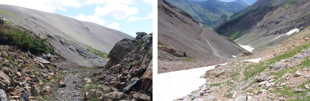 From there, I followed Yule Pass Trail to northwest. This trail used to be a mining road, but the mountain has re-claimed it and is healing its scars. In a lot of areas it’s impossible to tell there was ever a road around this mountain. Some areas were steep, but the runnels were all crossable.