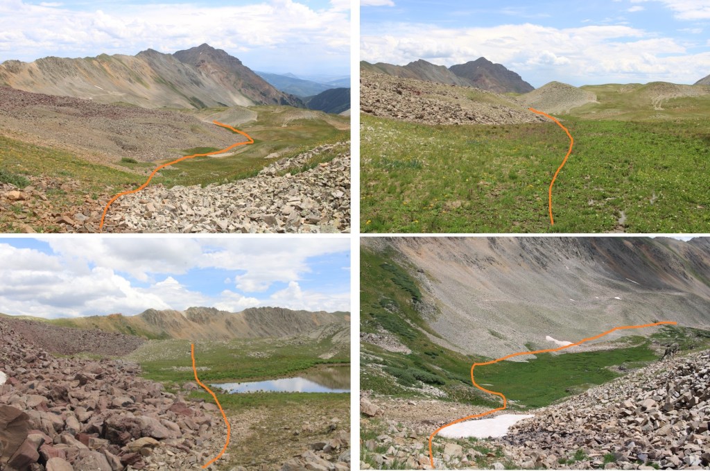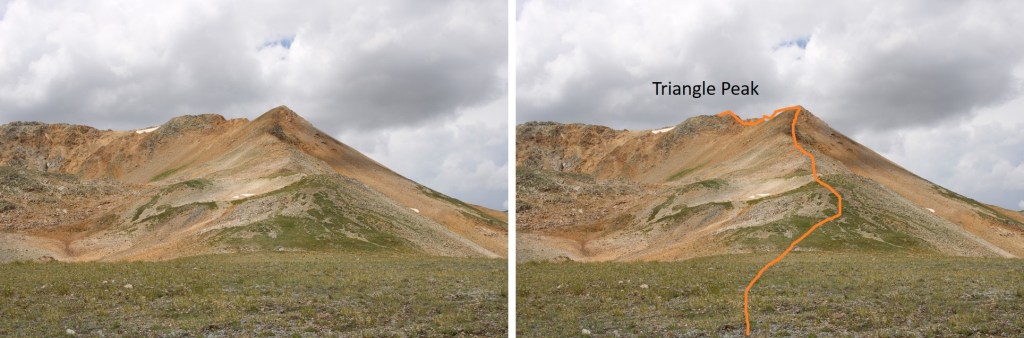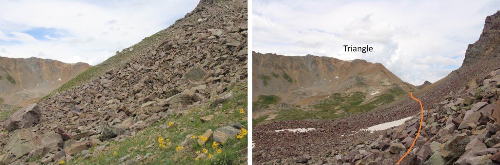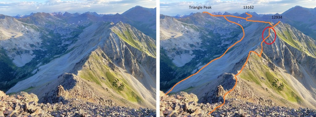 I’d thought about summiting a few more peaks in the area, but as you can tell from the picture above, the weather was moving in, and I wanted to get back below treeline. Here’s the route I took out of the basin. Basically I made my way to where the maroon rocks met the tundra, and followed the rocks out of the basin. The dotted line is my route from 13162 to the saddle of Triangle Peak