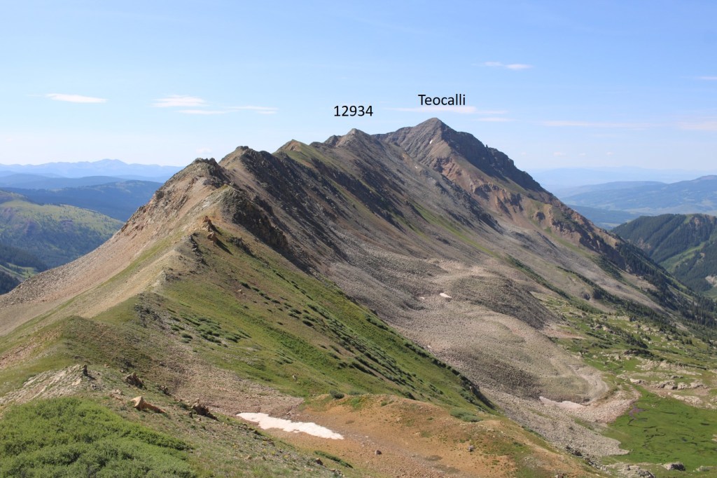 I followed the ridge north, as I descended to the Teocalli/PT 12934 saddle. This was full of loose rock. I put on my microspikes and navigated down the class 2+ terrain to the saddle.