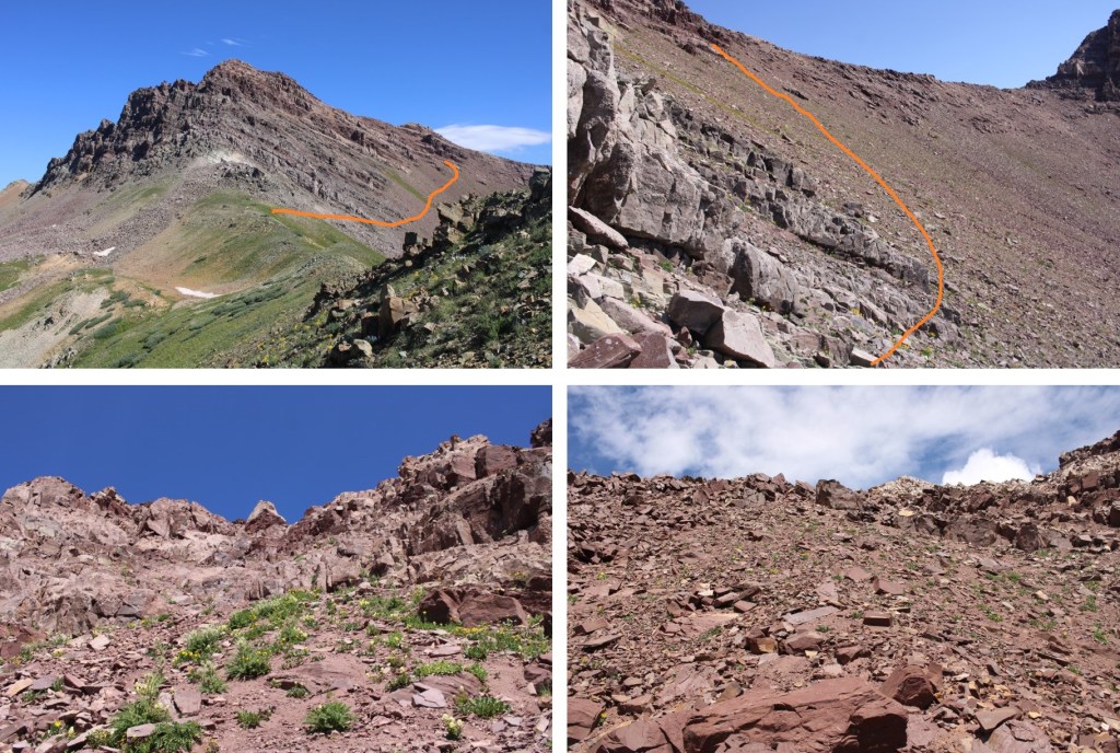 From the 12934/13162 saddle, this is the route to the ridge. It’s all class 2. There are actually 2 gullies that ‘go’. I took one up, the other down, and they both felt about the same difficulty wise (difficult class 2).