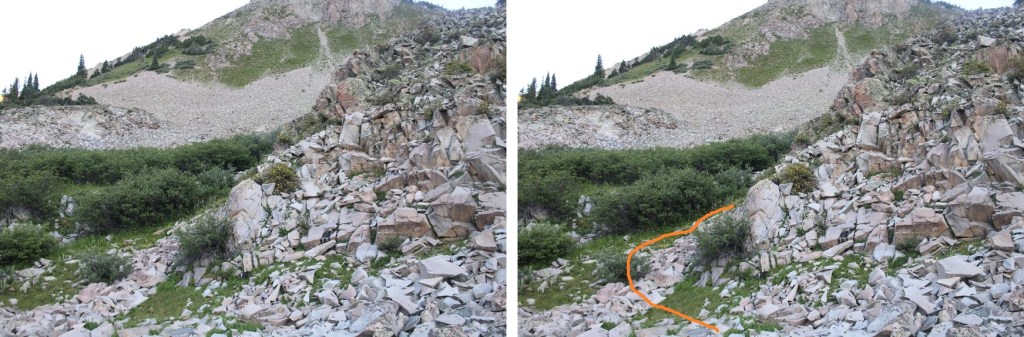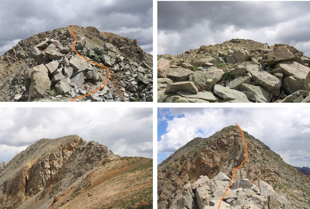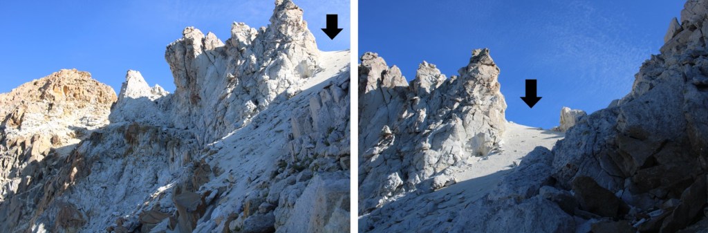 Now in the upper basin here’s my route to the ridge. This is choose your own adventure, and I’m pretty sure you could pick any line and it would go. The arrow shows where I ascended the ridge, via a small gully.