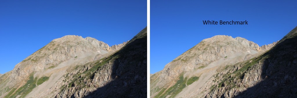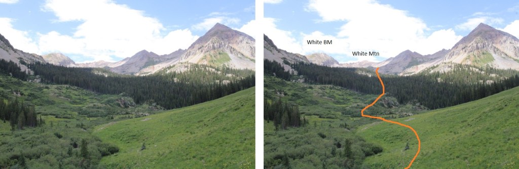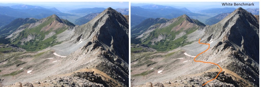 Now’s a good time to look west. This is the route I took down from White Mountain to White Benchmark. I stayed just under the cliffs. You’ll use this information later