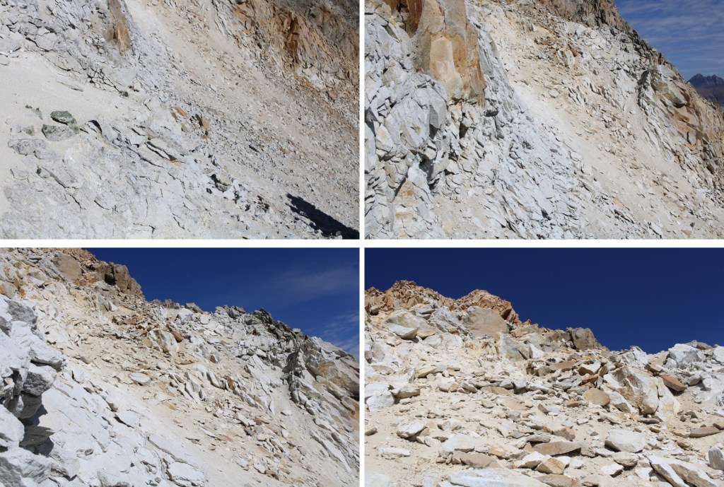 To summit White Mountain, I had to once again dip down, then re-ascend to the ridge. Microspikes were extremely helpful here. This is the route I took. Once I left the white dirt and made it to the brown rock, this became a class 3 scramble on questionable rock. It looks like the terrain shifts constantly, so be careful picking your route