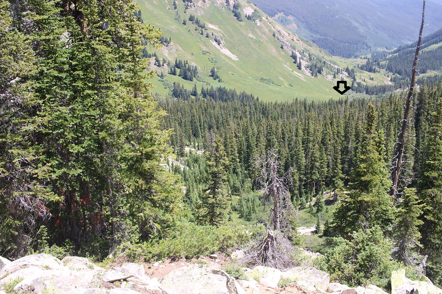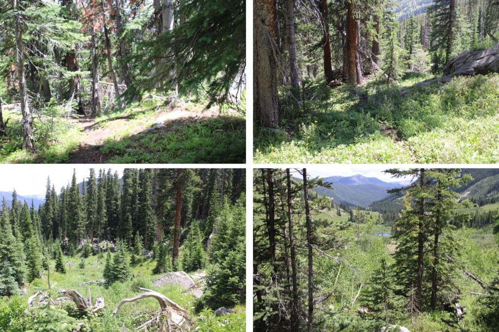 Once in the trees, route finding becomes more difficult. There are many game trails in the area. Pick one and follow it southeast until it runs out, then pick another one and continue following it southeast. Repeat. Keep the creek/drainage to your left (east).