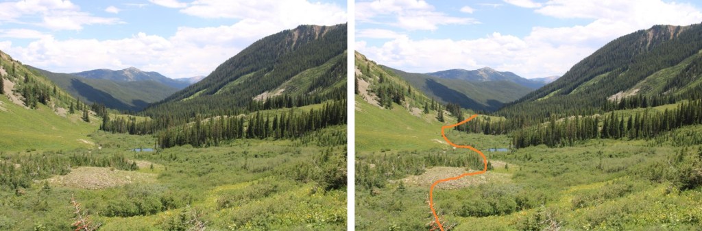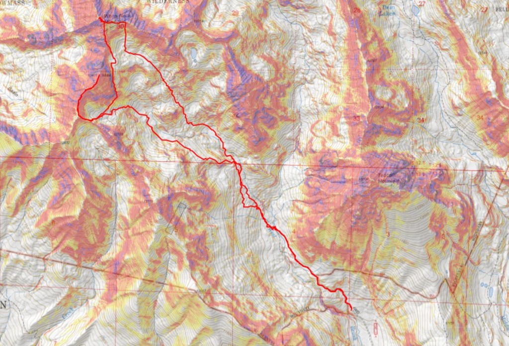 Now is a good time to get a look at the overall route northwest. Once in the trees, it’s difficult to know where you’re going until you make it into the basin