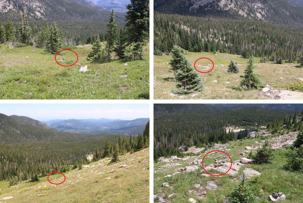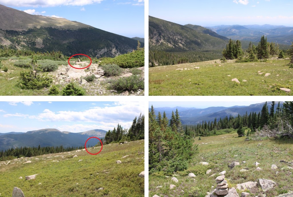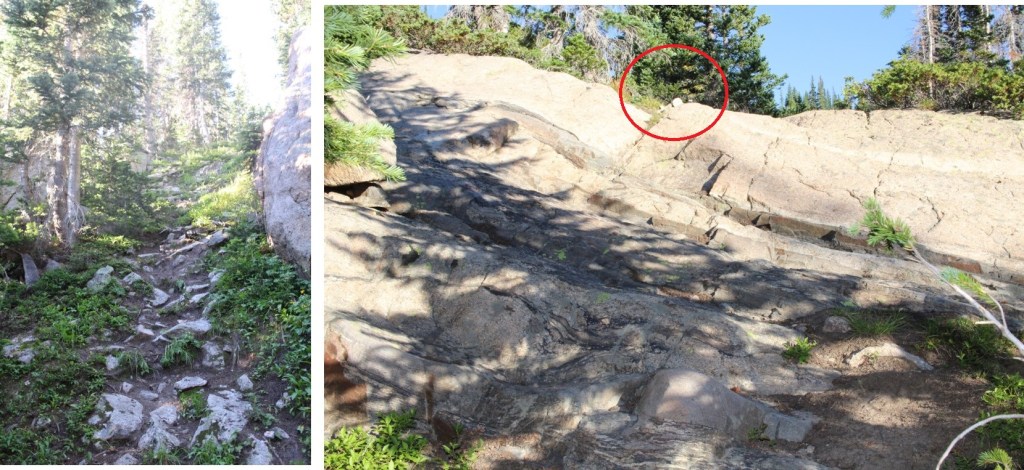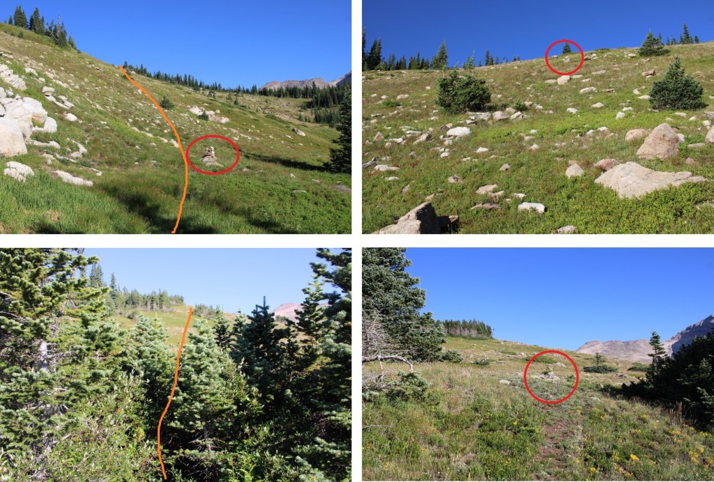 After crossing the creek, I followed the trail northeast to treeline. When the trail ended, there were plenty of cairns to guide the way (circled in red).