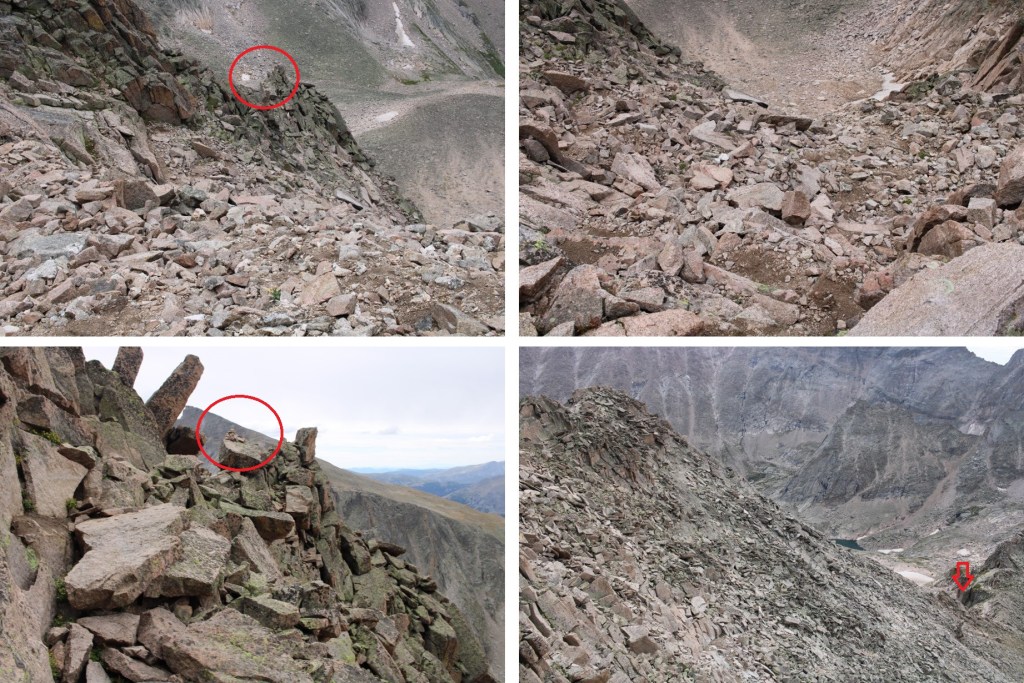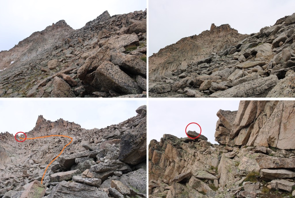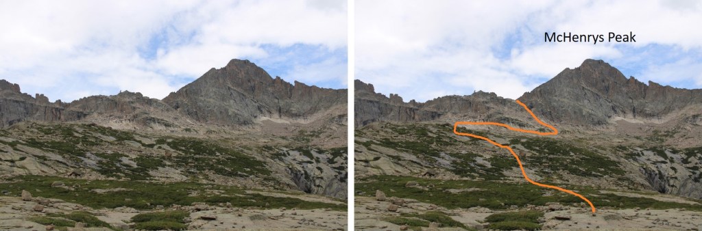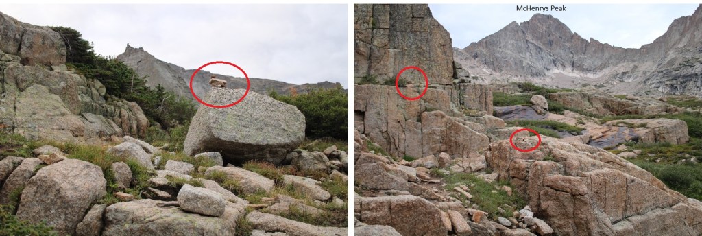 Here the trail kind of fizzled out, but I continued following cairns as I crossed a small creek, and headed southwest towards McHenrys Peak. There are a ton of cairns in this area (circled in red).