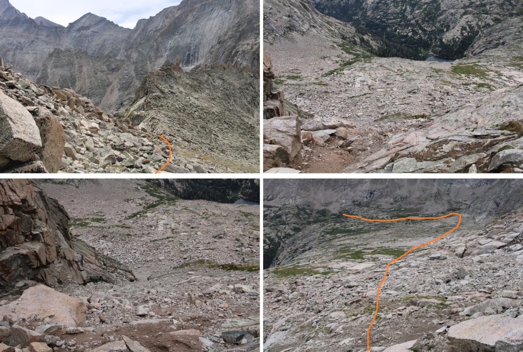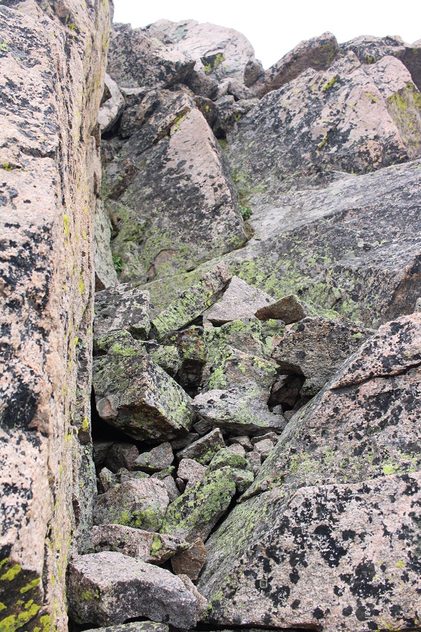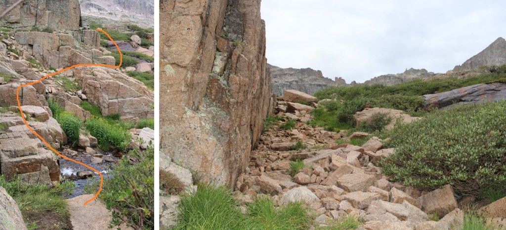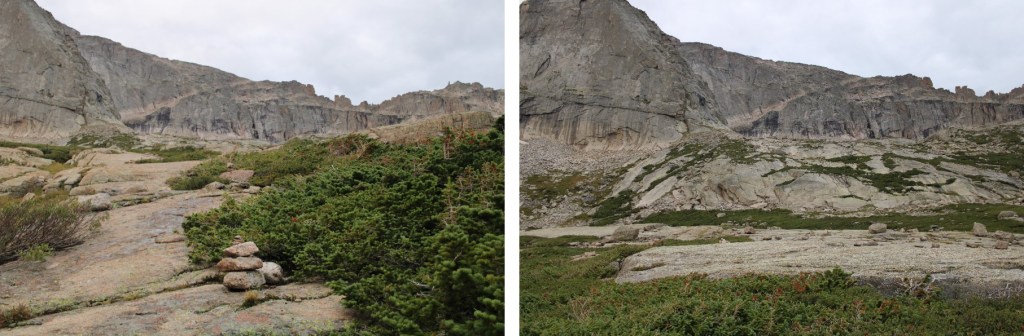 There are still tons of cairns in this area, but choose your route based on the best conditions. The rocks are very slippery where they are wet. I was aiming for the gully below Stone Man Pass.