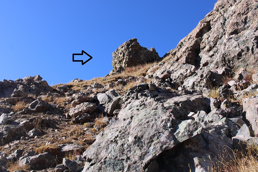 I don’t recommend this route, because this is where it led me: That arrow points to a 40-foot class 4 chimney I’d have to descend.