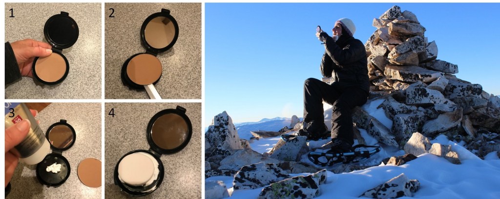 Sunscreen: OK, so it’s cold above treeline, but due to the reflection of the sun on the snow sunscreen is still needed. This can be problematic because a tube of sunscreen freezes in the winter above treeline. Using an aerosol spray isn’t practical for obvious reasons (wind) and the sunscreen that comes in a deodorant-like stick doesn’t apply evenly/melt when frozen. To combat this, I went to the dollar store and bought a compact, took out the powder, cleaned the compact out, and filled it with my favorite sunscreen. Then I placed a new compact sponge over it (30 sponges for $1 at the dollar store) and let the sponge absorb the sunscreen.
