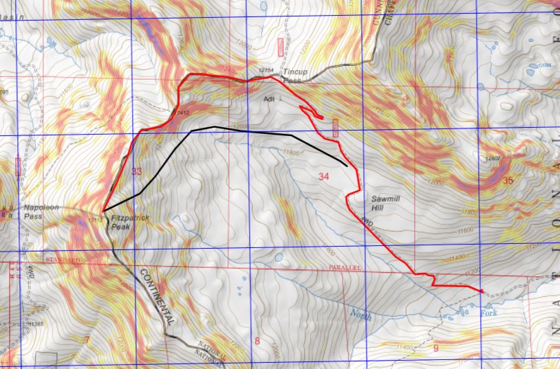 For example, in the picture below, if the normal route is in red, but there are winds coming from the north or west that day, you could avoid most of the wind by taking the black route instead, limiting your exposure time on the ridge.