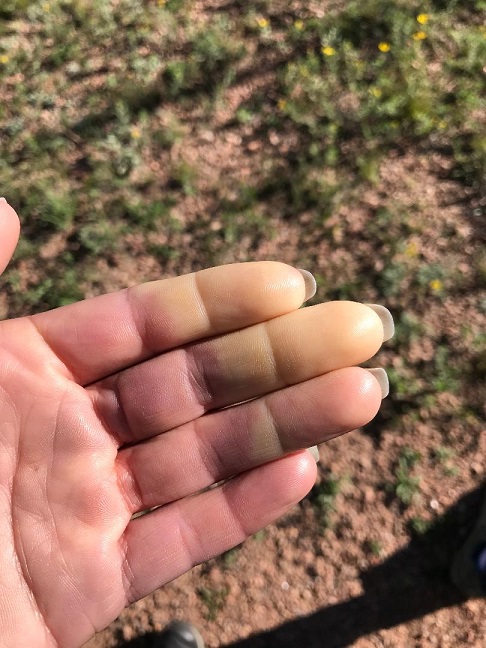 Raynaud’s causes some areas of your body — such as your fingers and toes — to feel numb and cold in response to cold temperatures or stress. In Raynaud’s disease, smaller arteries that supply blood to your skin become narrow, limiting blood flow to affected areas (vasospasm). This can happen even in warm weather. The picture below was taken of my fingers while camping on a 70-degree day.