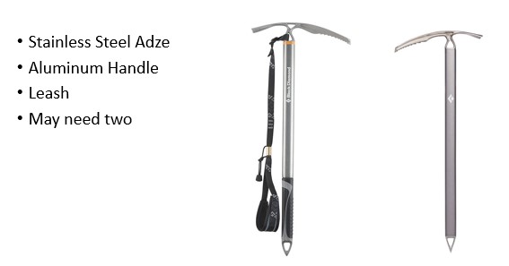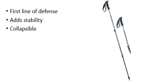 Collapsible Trekking Pole: These are indispensable for a variety of reasons at all times of the year. In the winter they are used for probing the snow to measure snow depth, determining the stability of ice at frozen stream/river crossings, and to whack snow off trees bent over with snow and blocking the trail. Make sure the handle is made of cork or plastic (not metal/aluminum) and easy to manipulate while wearing gloves. When not in use because you’re using your ice axe, collapse and attach to your pack with a carabiner. Also, a trekking pole is your first line of defense against 2 and 4 legged animals.