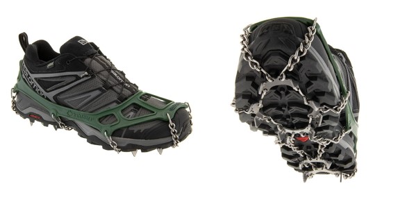 Crampons: Make sure they’re made of steel and not aluminum (aluminum bends) and have front facing spikes for traction. Learn how to use these before trying them in the elements for the first time, as they can be tricky to put on correctly, especially while wearing gloves.