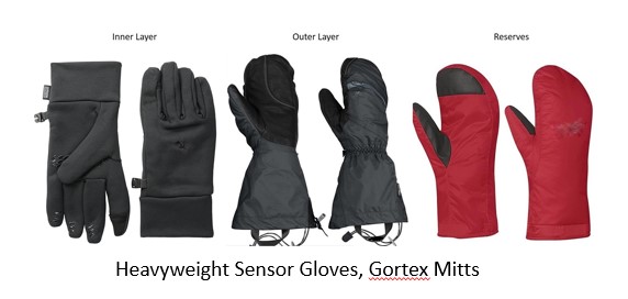 I bring along 3 pairs of gloves: I wear two at a time, and have the third in reserve in case I loose one I’m wearing: The wind above treeline can be ferocious, and I’ve seen gloves blow away in the wind. If you have Raynaud’s and you lose a glove above treeline it’s quite possible you’ll be losing fingers with it. I buy all gloves one size bigger than I normally wear. This allows for my hands to swell at altitude and makes them easier to put on/take off as needed.