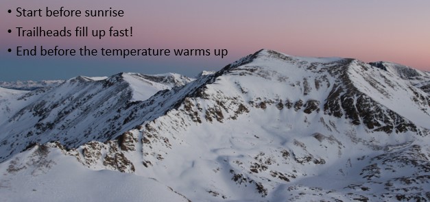Start Early: Just like in summer, when you want to start early so you can be down below treeline before the noon storms,in the winter you want to start early so you can be down before the worst avalanche danger I’ve found the trailheads in Colorado fill up fast! Many of them before 7am. A side note with popular trailheads, don’t keep valuables in your vehicle, as thieves frequent these sites