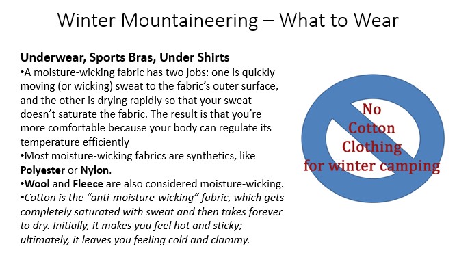 Don’t Wear Cotton: Cotton is heavy, takes a long time to dry, adds to rapid body heat loss, and absorbs too much moisture. That means you stay wet/cold for a long time. This includes jeans and that cool ‘It’s another half-mile or so’ t-shirt. Instead, pick a synthetic fiber such as polyester, nylon, fleece, or merino wool.