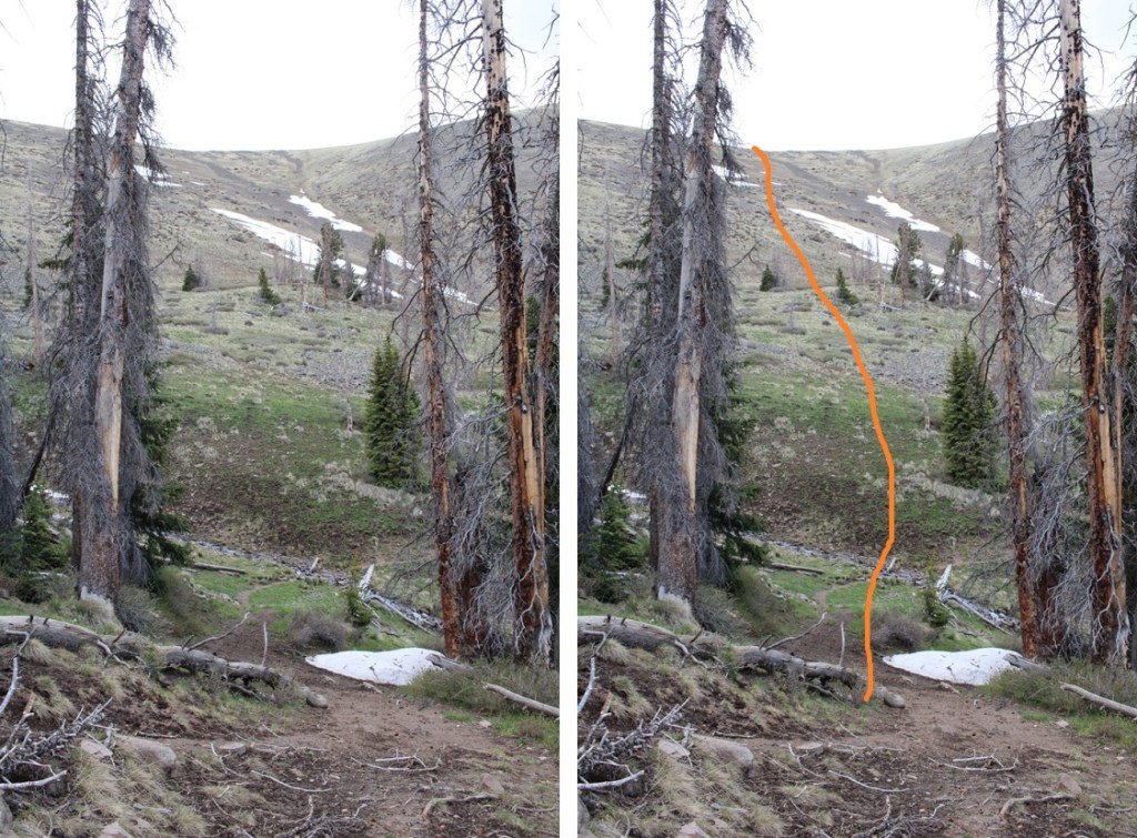 A trail picked up on the other side, but quickly dissipated.  To combat this, I just kept heading north-northwest up the basin, towards the gully I could see ahead of me to the northeast (I know that sounds contradictory, but I had to make my around the trees to get there.  If you’re doing this in the daylight, the gully should be obvious above the trees).