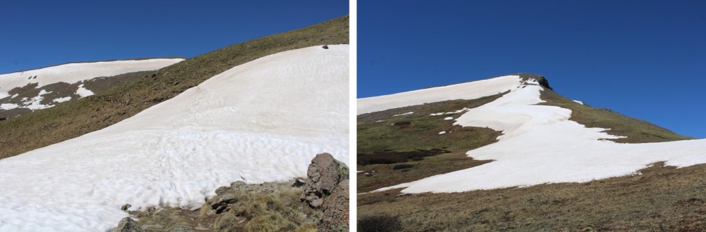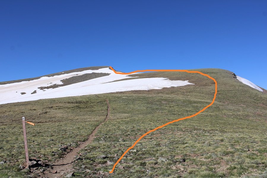 To avoid the snow on the way up (circled in red) I decided to just ascend straight up the slope.  (I crossed the snow on the way back down, and this is mainly where I wished I’d had an ice axe).