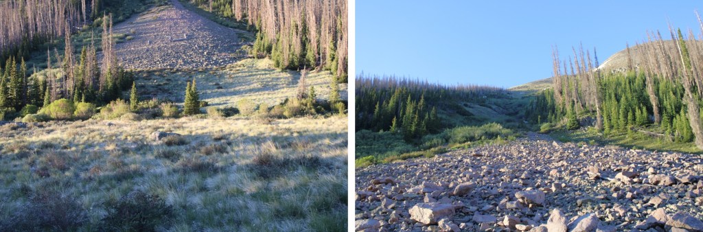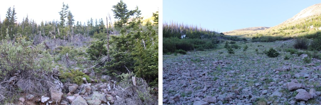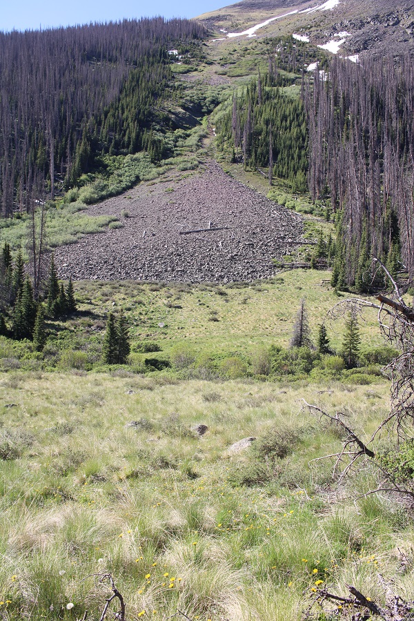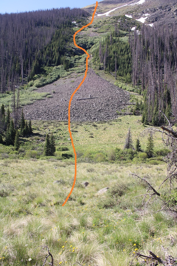 After hiking for about 5.4 miles, I came to a clearing, and to my left I could see an avalanche runout. It was my plan to climb up this runout and see if I could summit the peak this way.