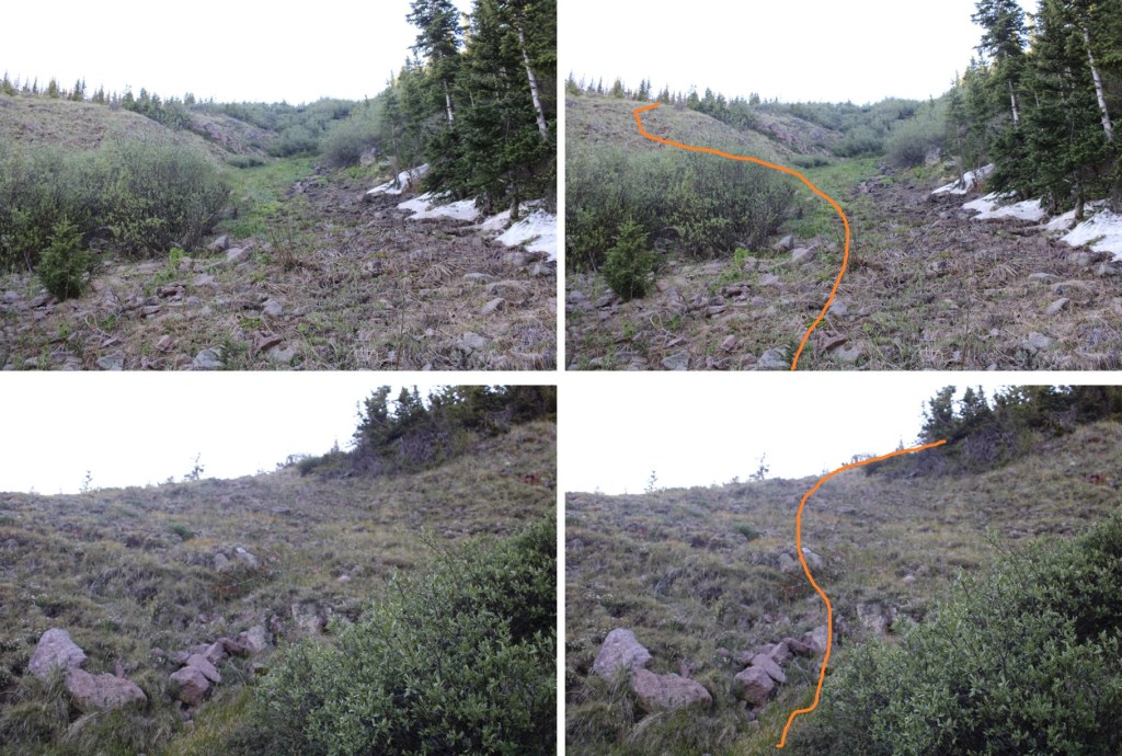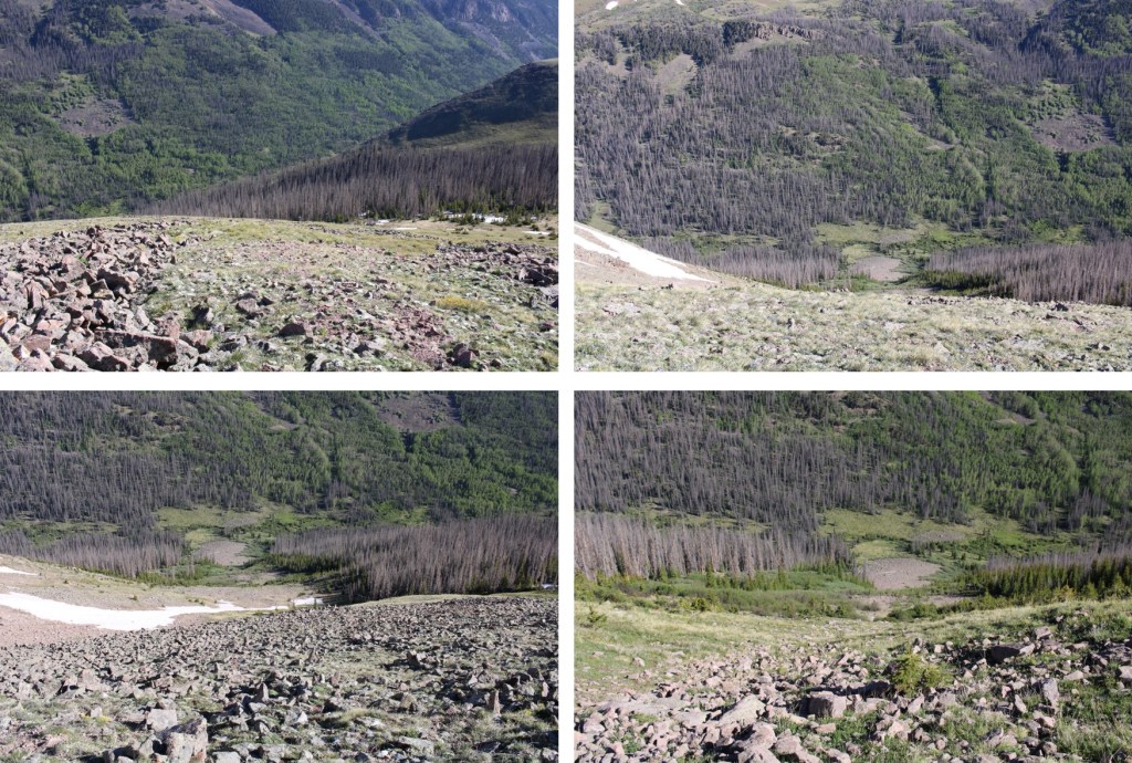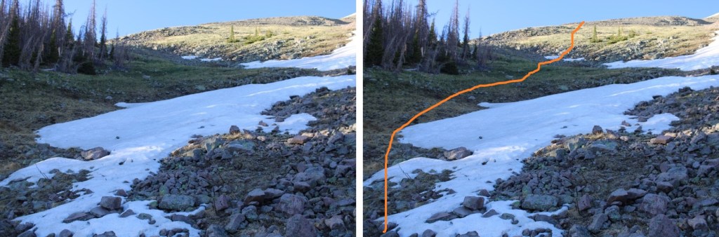 And now, to head back down. I just retraced my steps back to the avalanche runout, heading northeast