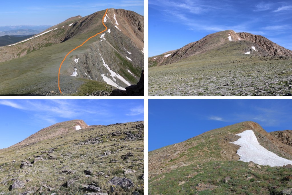 The route will be easily visible.  There are rock ledges if you go to far left or right.  You want to take the tundra northeast until you make it to the ridge, and then turn left and follow the ridge west. Here I gained 850’ of elevation in .75 miles