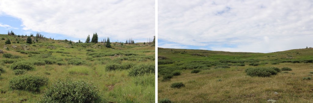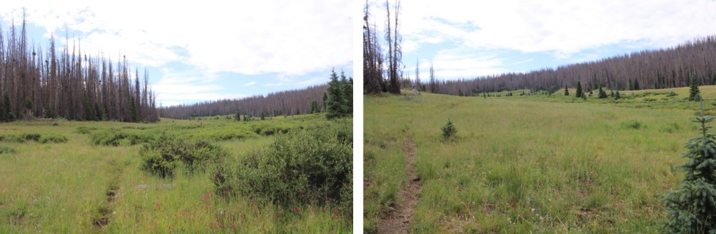 I crossed a creek, and continued on through a rather large gulch. The trail begins to fade here, but as long as you stay to the left of the willows, you should be able to find a trail. In the early morning hours I saw a mama moose with her baby munching on the willows.