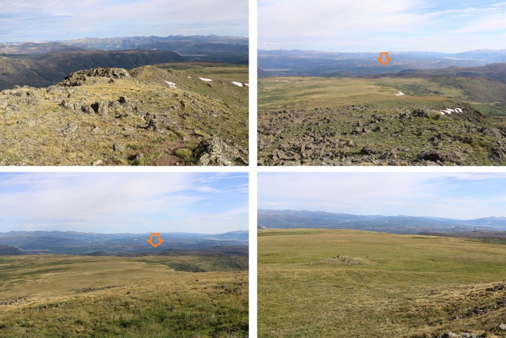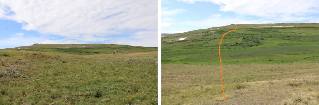 I kept heading south, still with no visual landmarks, and eventually came to a marshy area and a hill to ascend. This was muddy and wet, and choose your own adventure. I navigated the willows and made it to the top of this hill/