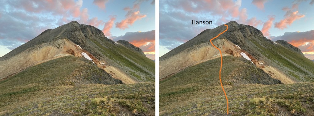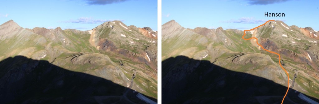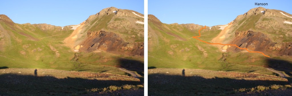 Here’s an overview of the route I would take to the ridge, using mainly a mining road, then finding a grassy shelf that led to a short class 2+ gully.