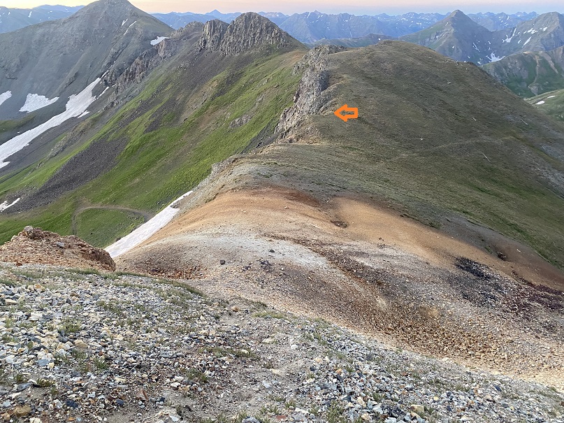 This is where I exited the ridge and descended back down to the mine.  I made myself a tiny cairn (seriously tiny, no more than 5 inches high, but I knew it was there) so I’d know the right gully to take.