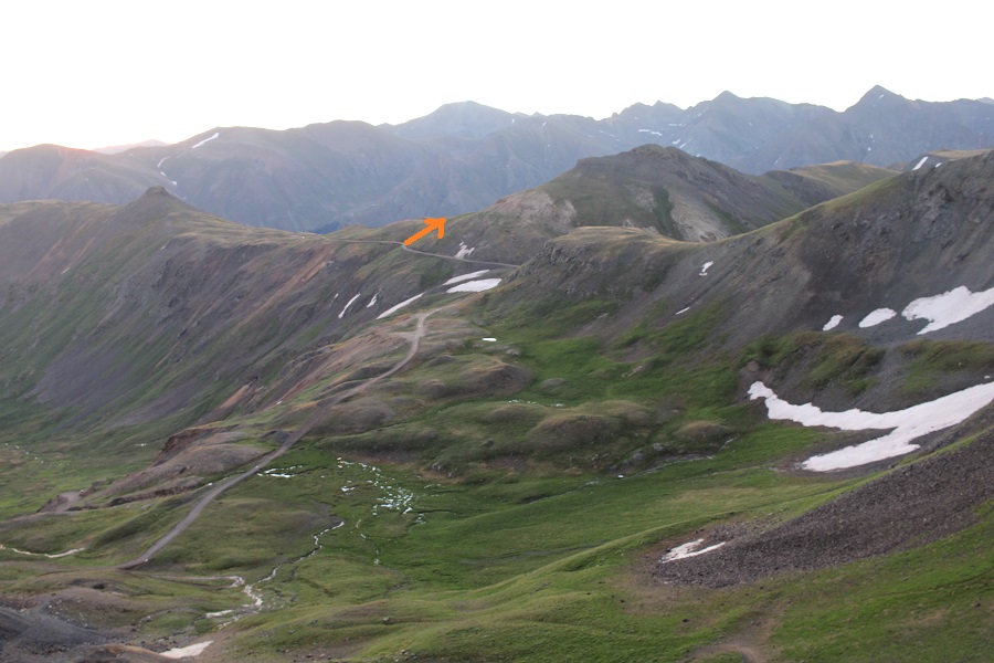 This part was tricky in the dark, but at 12615’ of elevation, there’s a side road that goes further up to another mine.  I took that road southwest.