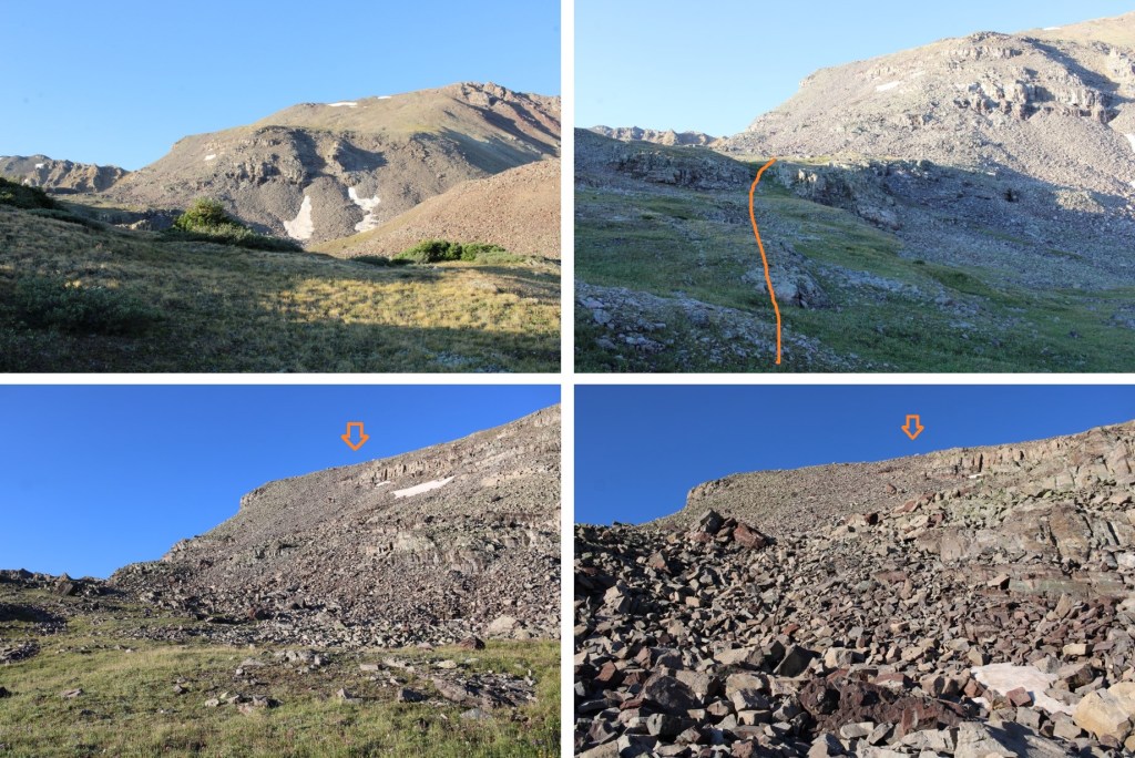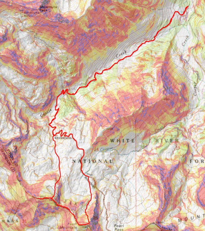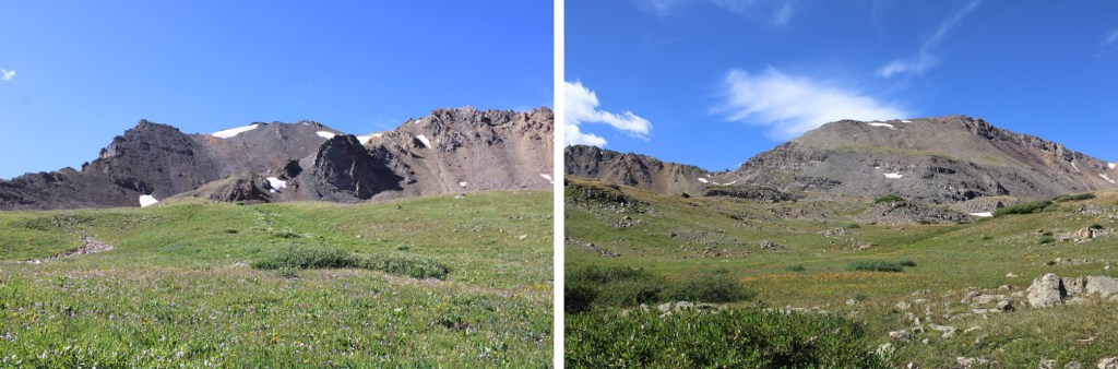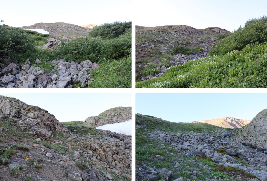 After hiking for 3.6 miles, and at 11800’ of elevation, I left the road to ascend west, up a game trail through a ravine