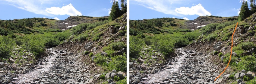 The gully is obvious, as it’s orange. I had a small patch of snow to get through first. I had the brilliant idea to glissade the 10 feet of snow. This worked perfectly, except when I hit the bottom I ran into a good 8 inches of sticky mud I hadn’t expected. I was stuck in the mud for a minute until I could pull my boots out.