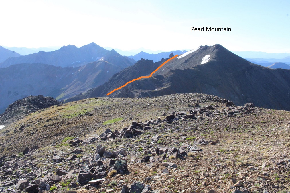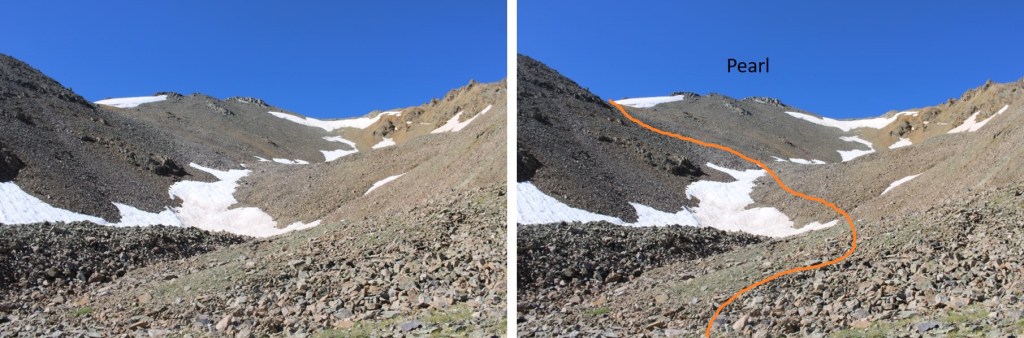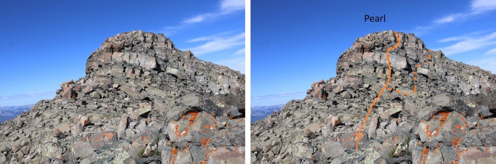 Here’s looking BACK at Pearl, the way I descended was class 4 (solid line) but when I looked back I noticed I could have descended on the dotted line, making it class 2