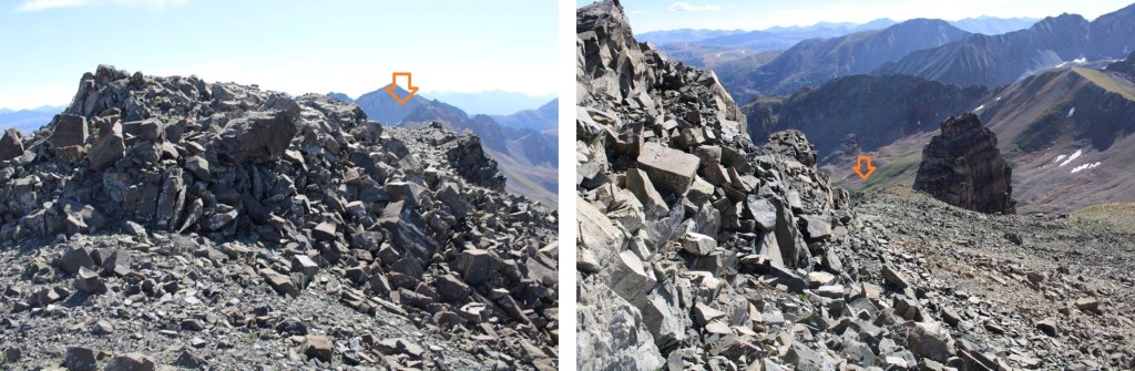 I continued following the ridge east, to an obvious orange gully. This part of the ridge was sketchier than the first part. In retrospect, I made some things class 4 when they could have been class 2, but the class 3 stuff was class 3, no way around it. I stayed straight on top of the ridge