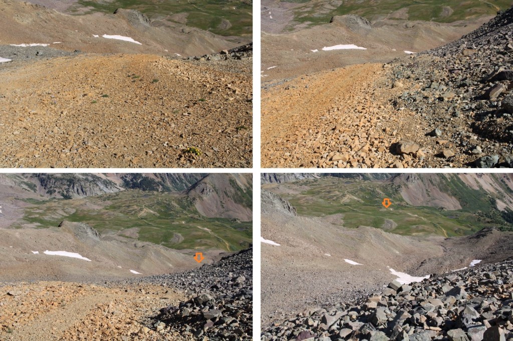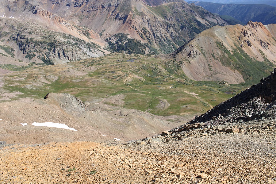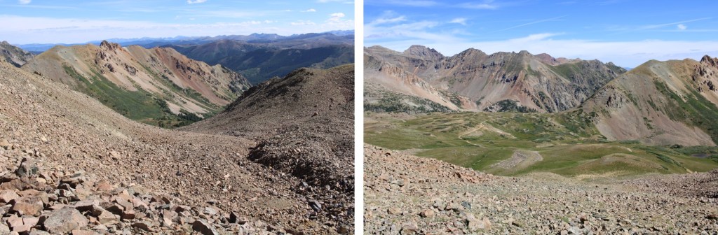 Ok, now to head down the gully. I was so glad I was going down this instead of up. It was seriously steep. It starts out as scree and ends with microwave sized rocks. You can see Pearl Pass Road in the distance. That’s what I was aiming for once I got out of the gully.