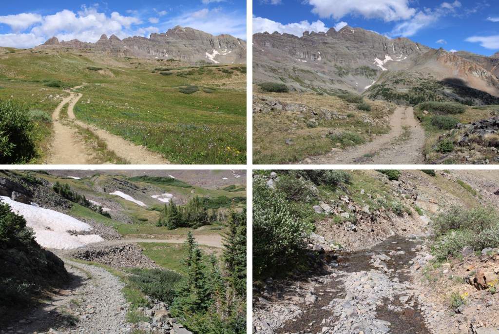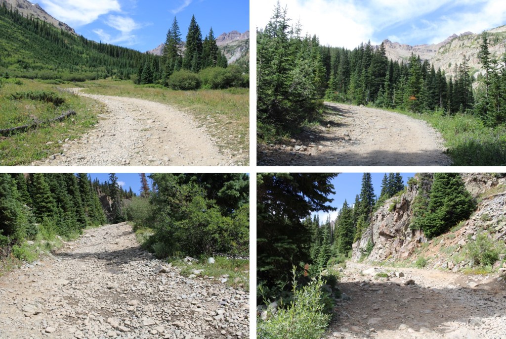 I was up and on the trail at 5am the next morning. I followed the 4WD dirt road southwest, towards the Pearl Pass/Montezuma Mine junction. About a mile into my hike I saw a bear on the trail (it ran away before I could get a picture) so those bear warning signs aren’t a joke.