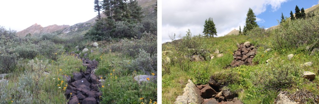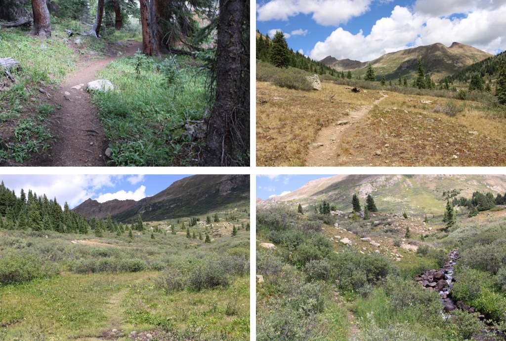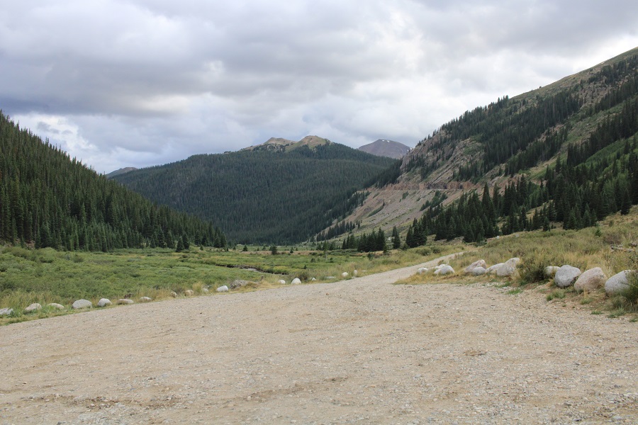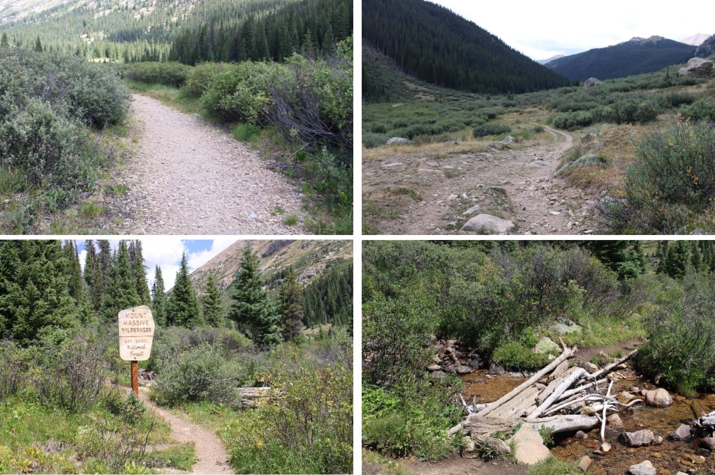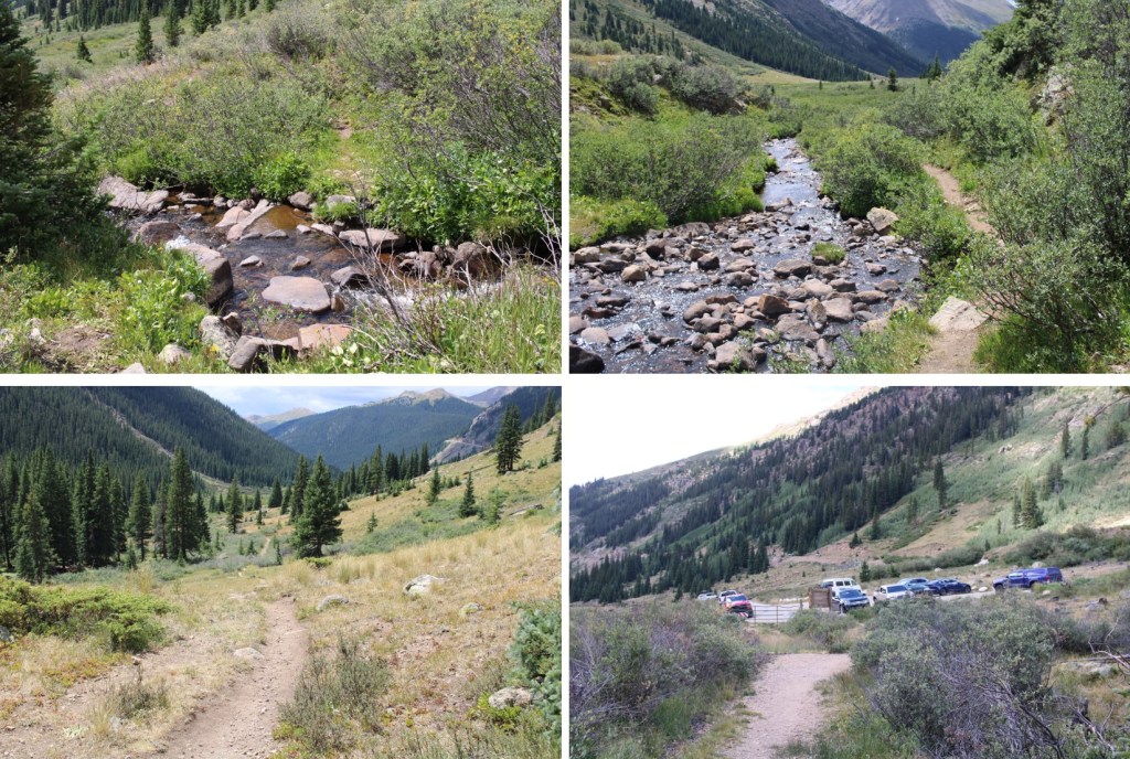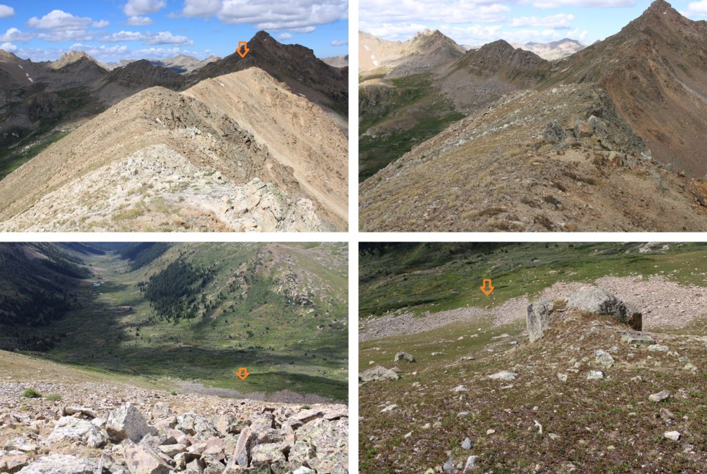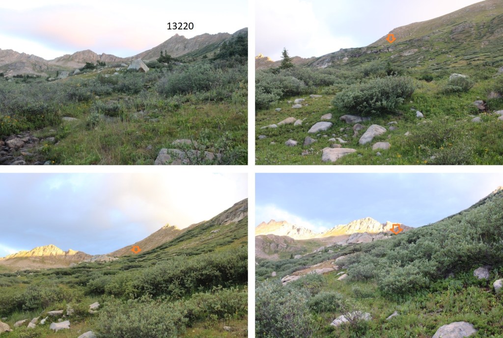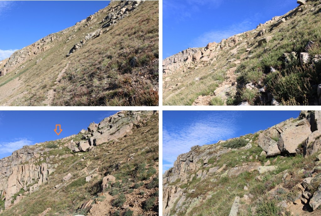 I followed the ridge until I made it to just before where I’d accessed the gully from 13220. Instead of heading down that way, I descended south into the basin below. This was the same way I’d ascended earlier that morning. This would be a good option if just doing 13291. It’s class 2, and led me into the basin. I aimed for the thinnest section of rock below. The entire time I was hiking down, I was looking for the dry creeks that led me in, knowing they’d eventually bring me back to the creek crossing and the trail. They were easy to spot from above.