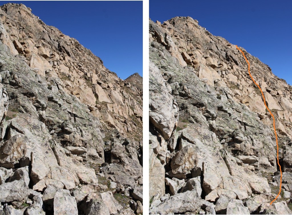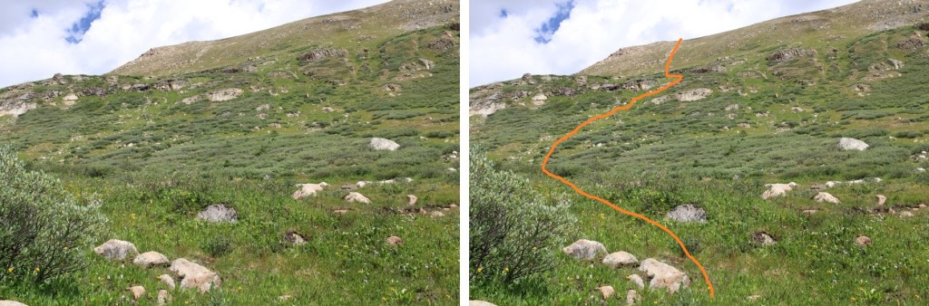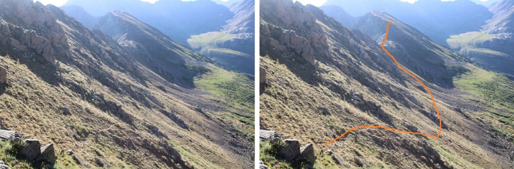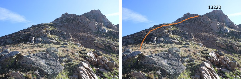 The next time I was here, two days later, this is the overall route I took to get past the steep rock in front of me. Also, this is a good time to put on your helmet if you haven’t already done so.