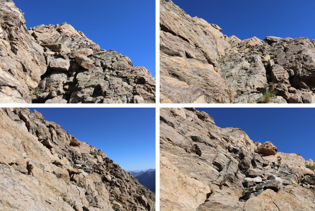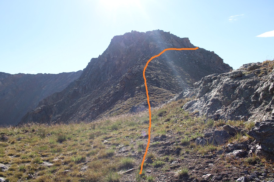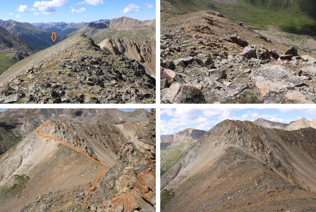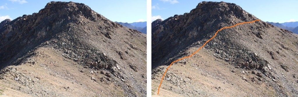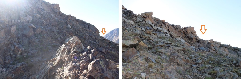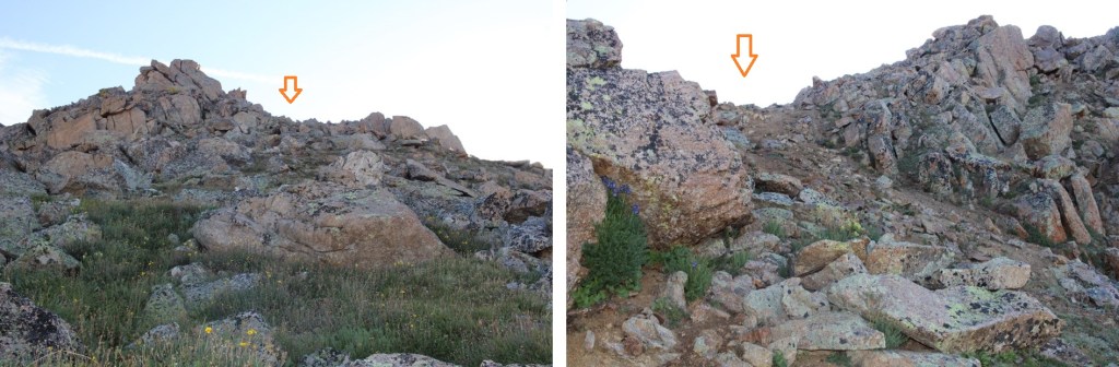 This is the overall route I took, dropping down about 25 feet, aiming for a break in the rocks, and then heading up the east side, keeping it mostly class 3, but once again, it’s choose your own adventure.
