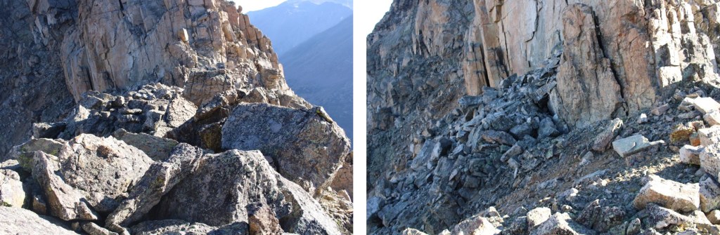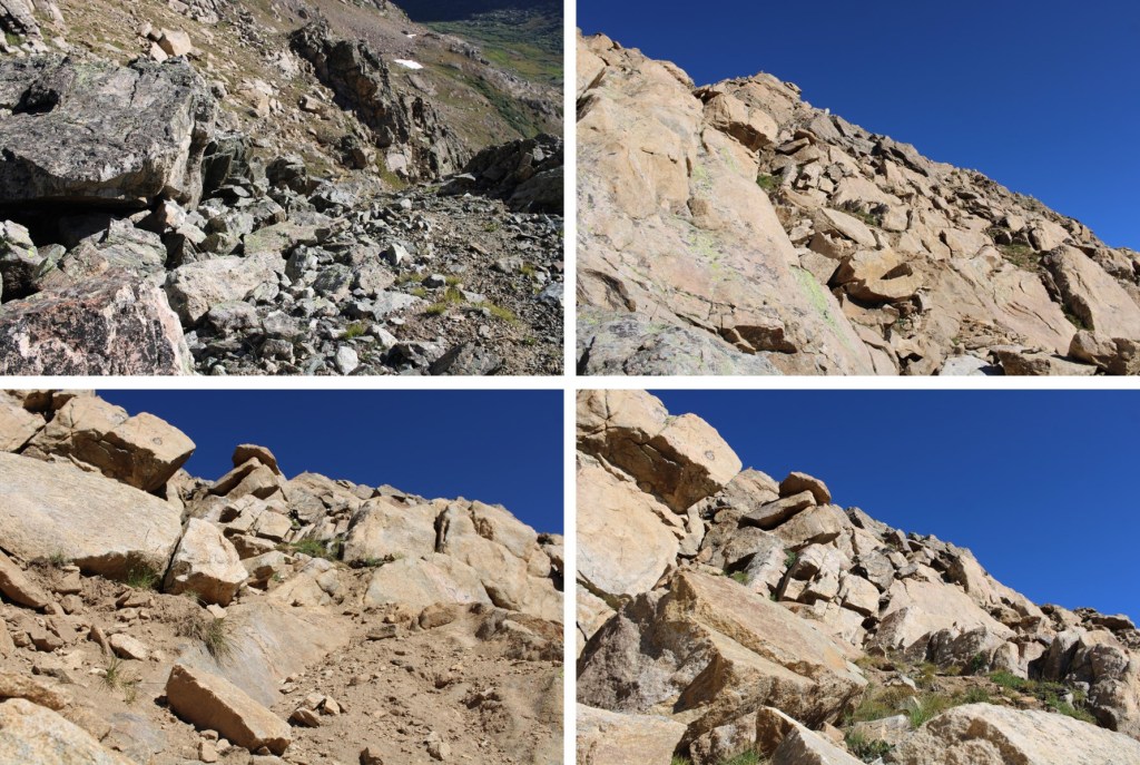 This looks loose and fraught with exposure, but the route is actually pretty solid and wider than it looks from a distance. I started out rock-hoping on stable boulders, then descended west about 100 feet, staying as close as I could to the rock wall, to the base of a gully