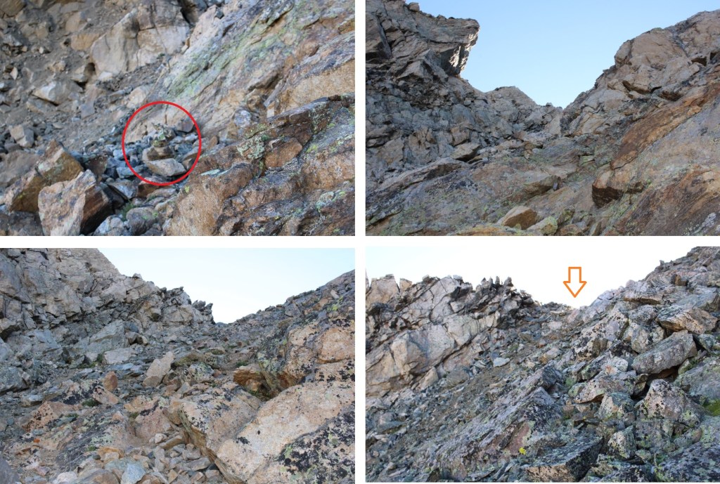 At the base of the gully, I turned right and ascended the 100-foot gully. Climbers left was extremely loose, but the right side was steep but stable rock. I chose to stay on the stable rock. There is a cairn (circled) at the base of the gully, indicating where to ascend.