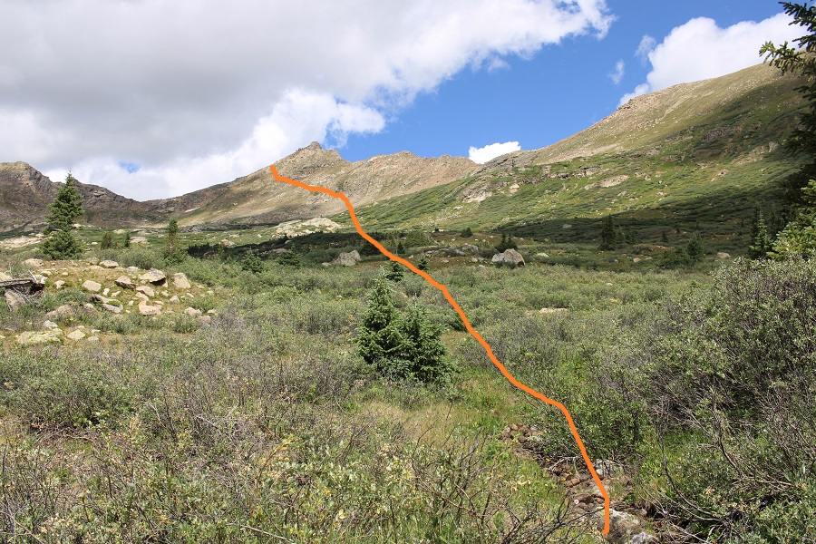 Here there is a faint trail for a few yards, and then it fades out. I headed northwest into the upper basin.