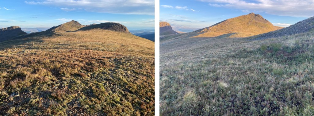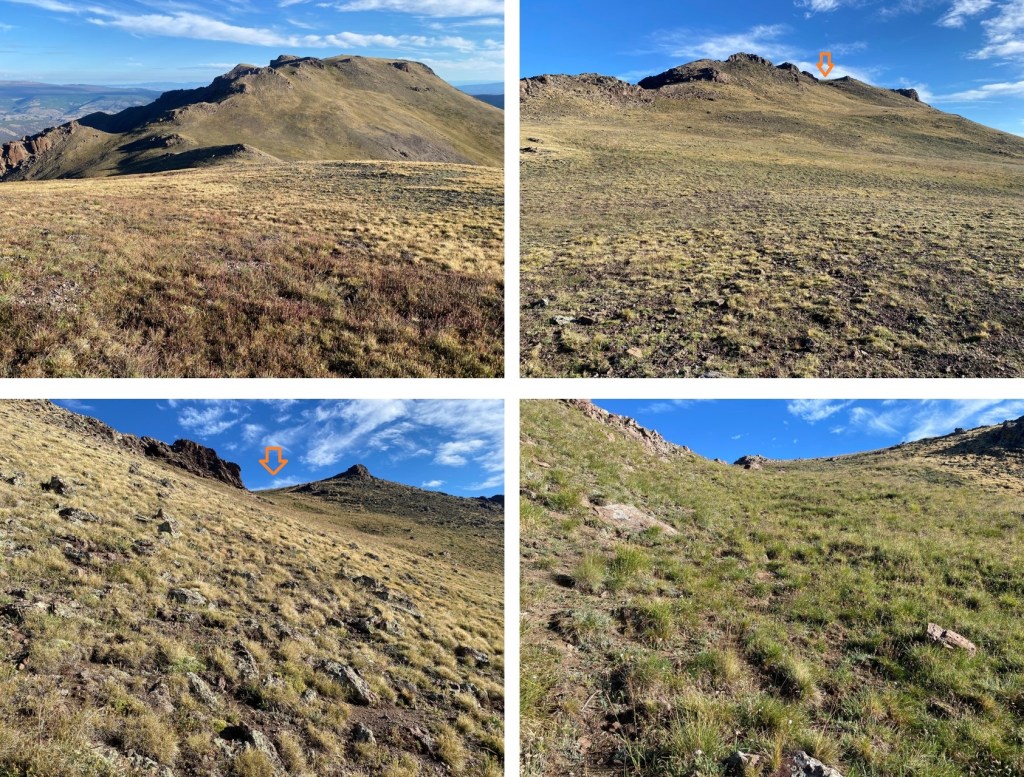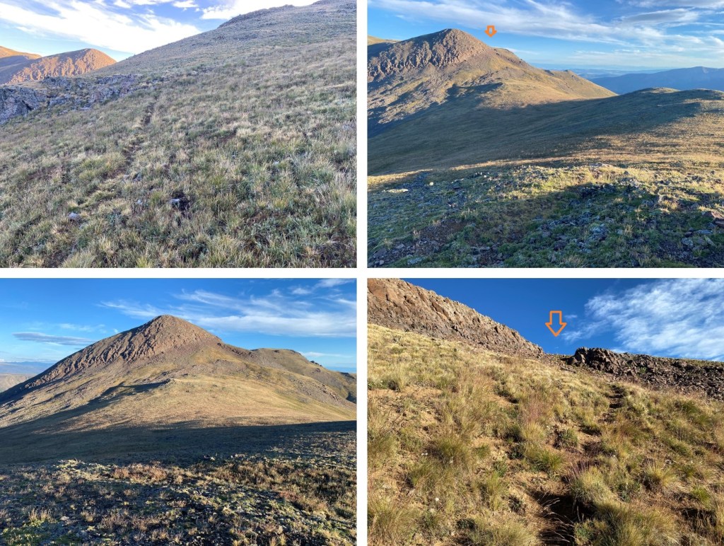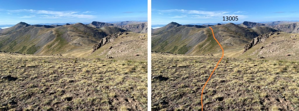 Instead of re-ascending PT 13005, I stayed on the grassy slope to the left to gain the ridge.  There are some game trails here.