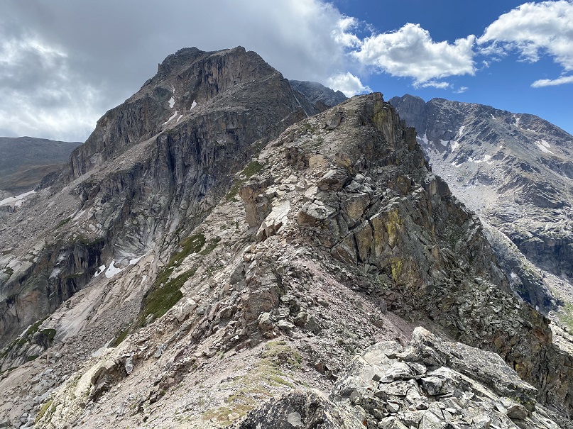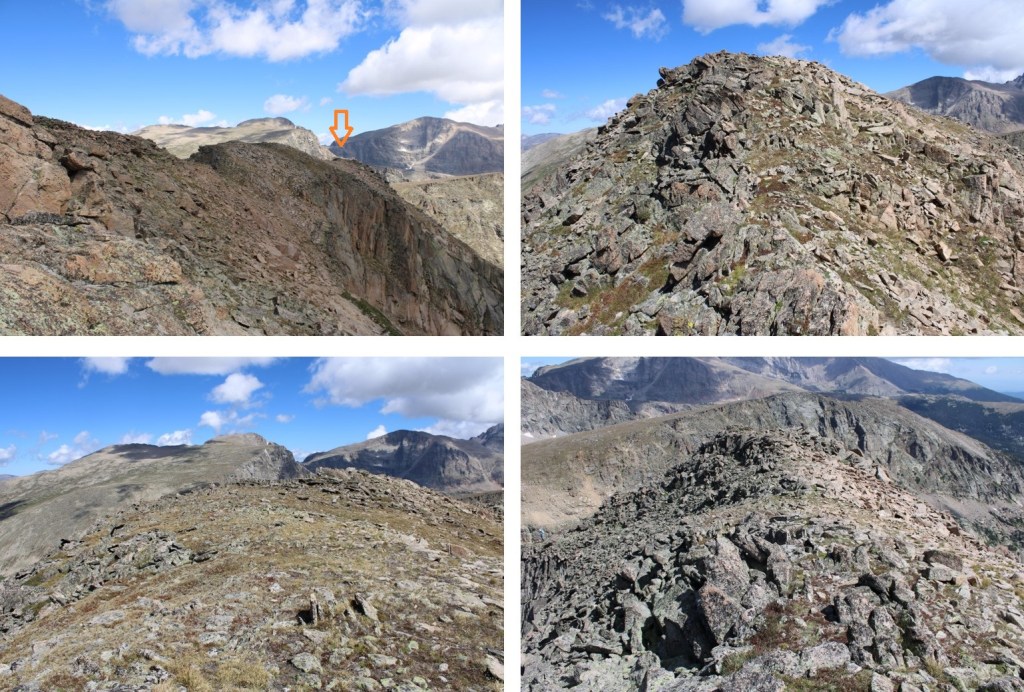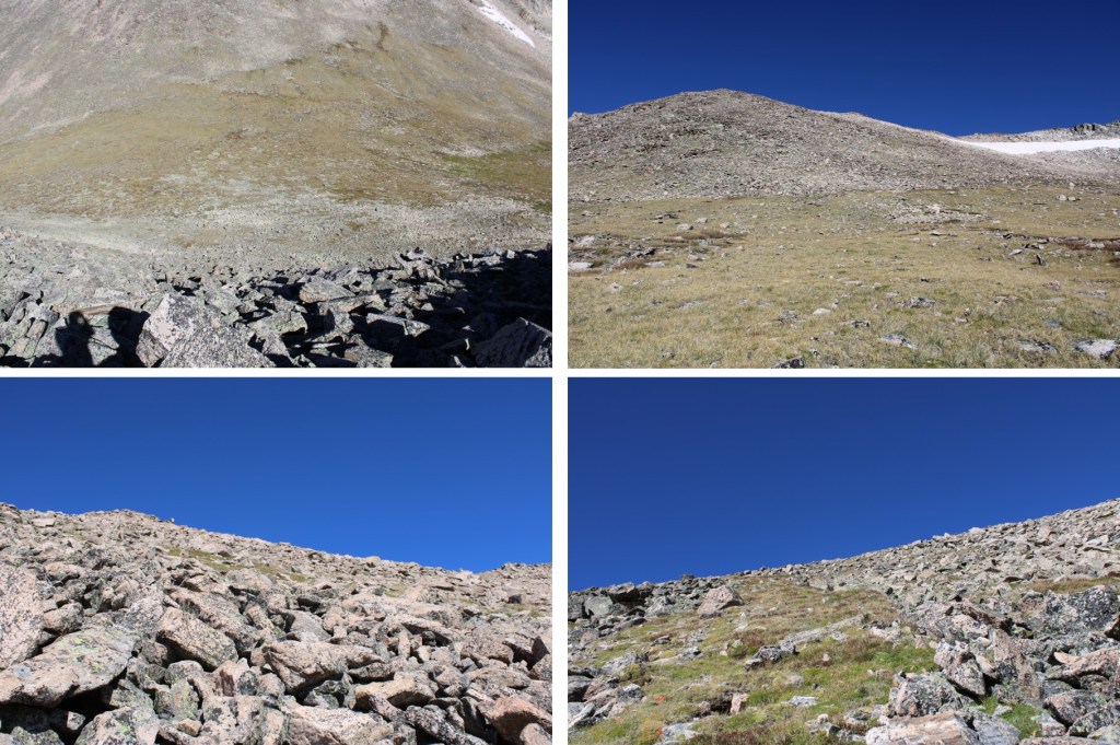 And that was it for the climbing for today.  I kept my helmet on because I still had a scree-gully to descend, but all the class 3 and 4 stuff was done.  I’d wanted to head over to Mt Alice today too, but clouds were forming and I didn’t think it was a good idea.  I headed towards Boulder-Grand Pass, turned right, and descended the gully towards Lake of Many Winds.  From the pass, it was 9.5 miles back to the trailhead.
