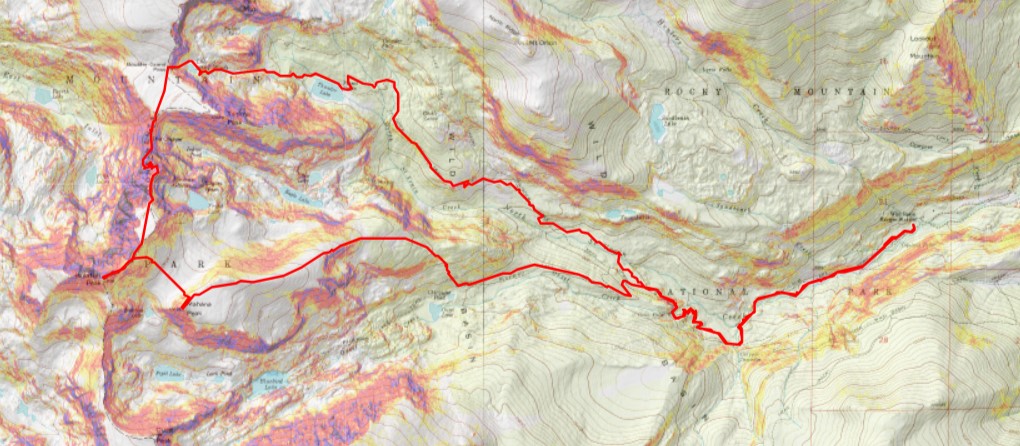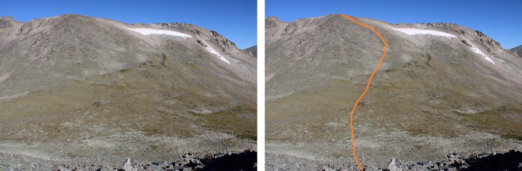 This is the overall route I took to gain the ridge of Isolation Peak.  If you look carefully, you will see a green band of grass that makes the route easy to follow.  I descended on rocky terrain, then was greeted with tundra, then rocky tundra as I ascended.