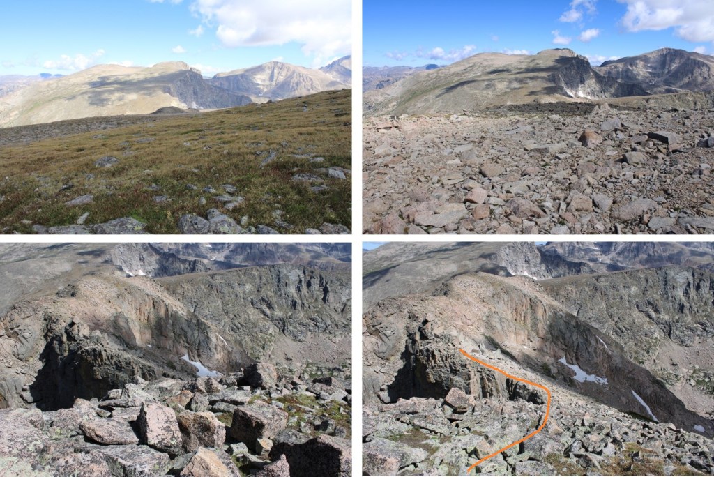 I made it to the ledge, descended another grassy ledge, then reascended a grassy ledge to re-gain the ridge